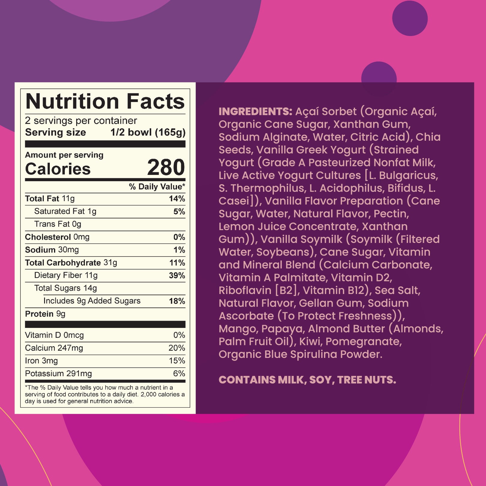 - Ingredients: Açai, blue spirulina chia seed pudding, almond butter, vanilla greek yogurt, kiwi, papaya, mango & pomegranate.