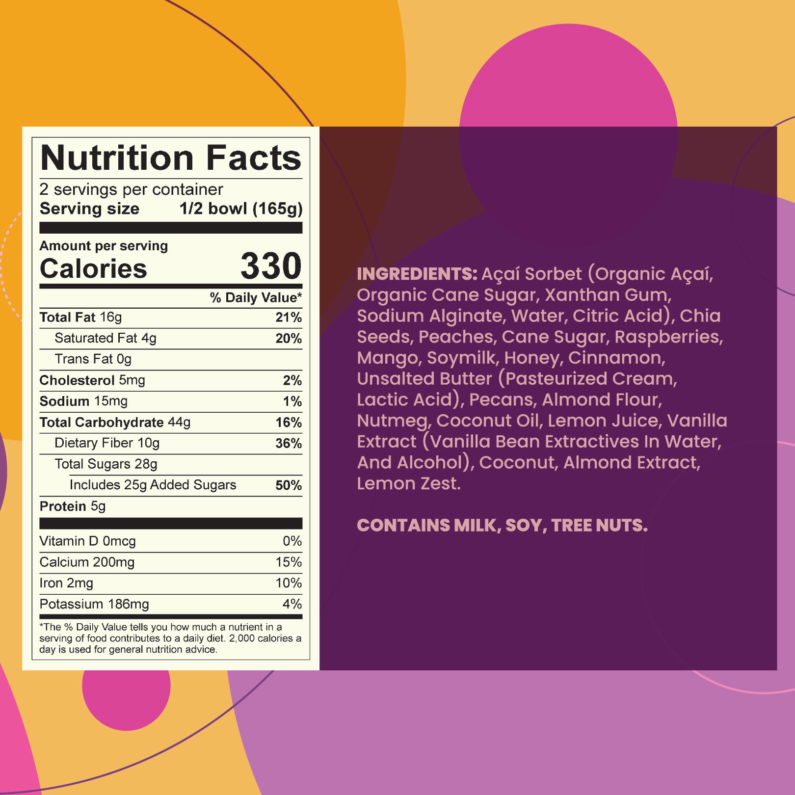 - Ingredients: Açai, caramelized peach chia seed pudding, honey roasted pecans, almond crumble, and topped with mango & raspberries.