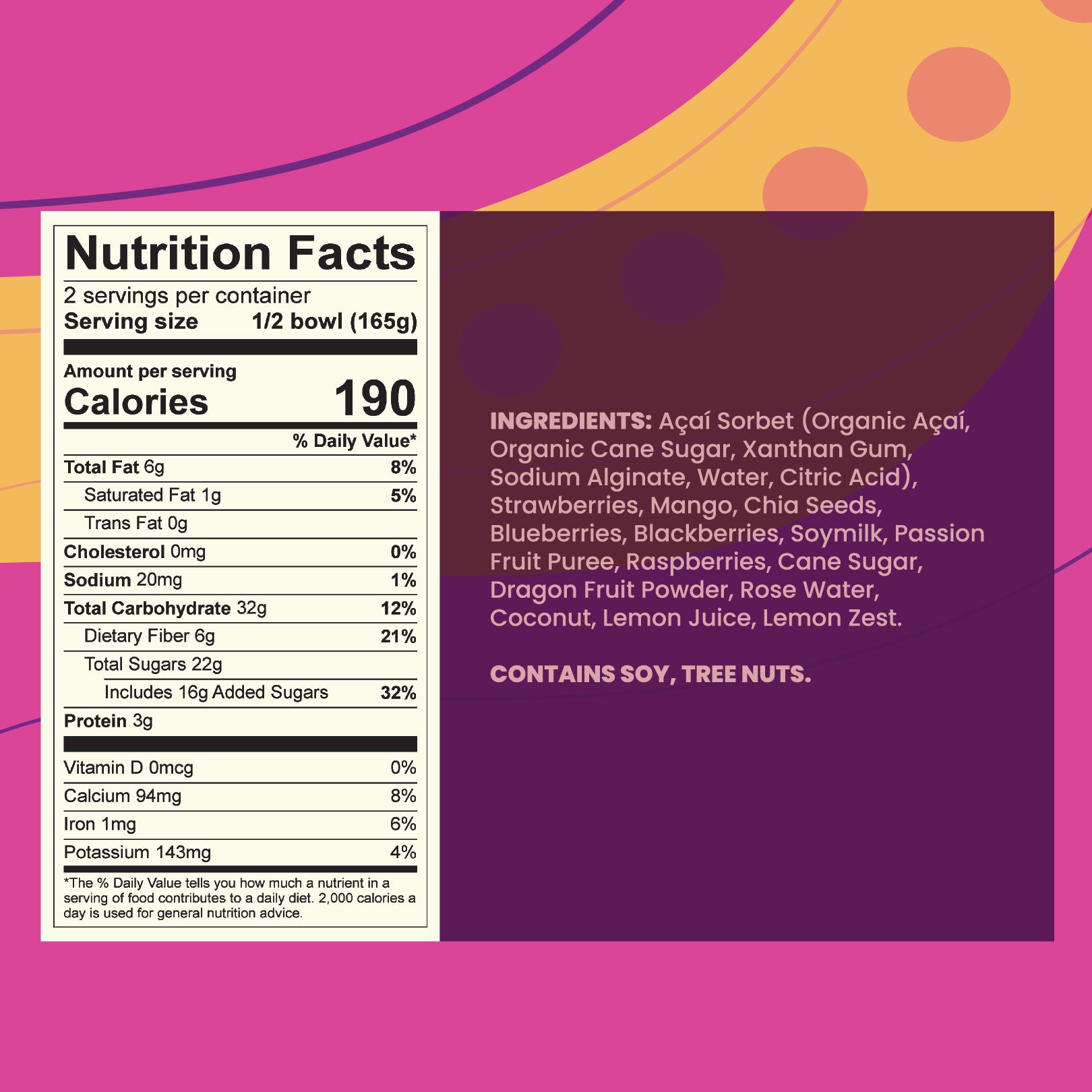 - Ingredients: Açai, rose water pink dragon fruit chia seed pudding, rose water infused strawberries, blackberries, raspberries, blueberries & coconut flakes.